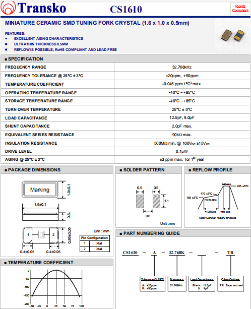 Transko晶振,CS1610晶振,進(jìn)口音叉石英晶體.超小型,薄型,質(zhì)地輕的表面貼片音叉型石英晶體諧振器,手機(jī)晶體,產(chǎn)品體積小,特別適用于各種小巧的便攜式消費(fèi)電子數(shù)碼產(chǎn)品,在移動(dòng)通信領(lǐng)域得到了廣泛的應(yīng)用,晶振產(chǎn)品本身可發(fā)揮優(yōu)良的電氣特性,滿足無(wú)鉛焊接的高溫回流溫度曲線要求.