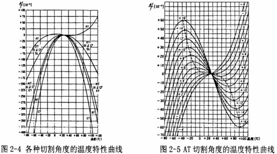 圖2-1是不同切割角度的溫度特性的比較。從圖中可以看出,當(dāng)溫度在大于30℃時(shí),按照AT角度切割的石英晶片的特性曲線比其他的特性曲線都平坦,說明在此溫度范圍內(nèi)溫度變化后頻率產(chǎn)生的偏移量最小,溫度特性也最佳,如圖2-5所示,同是AT切割的時(shí)候,當(dāng)切割角度有少量偏差時(shí)溫度特性曲線也會隨之變化。
