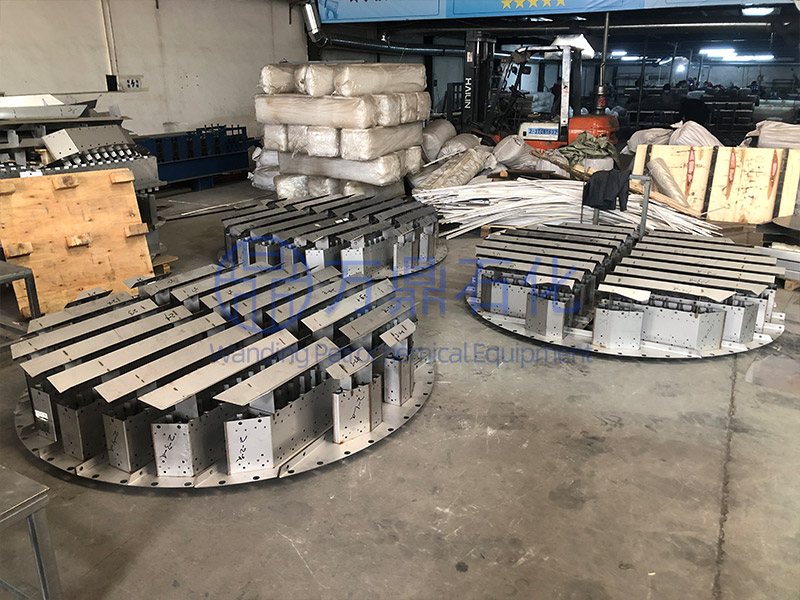 盤式分布器與槽式分布器相比,由于它的液面較低占用空間小,且布液孔處于同一液面高度(槽式分布器難以達(dá)到與各槽液面相同),故液體分布較均勻。它的**缺點(diǎn)是用作再分布器時(shí),難以達(dá)到濃度混合,而且液面不能過高,否則造成漏液,故布液孔一般開在底板上。此外,布液孔的布置不如槽式分布器靈活。在安裝位置上,盤式液體分布器要有足夠的氣體釋放空間,要求安置在距填料上表面150?300mm處;而槽式分布器則要求放置于填料定位器上,一般距填料表面50mm。