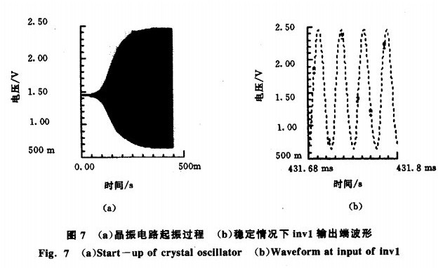 所有電路參數(shù)都設置好之后,使用Spectre進行電路仿真,可以得到晶振電路的起振過程及穩(wěn)態(tài)下的波形.從圖7(a)中可以清楚的看到晶振電路的起振過程,一般的起振時間需要幾百個ms.穩(wěn)定情況下invl的一端是正弦波,另一端是被放大了的近似方波,需要圖1中所示的inv2進行整型得到外形較好的方波并提供足夠的驅(qū)動能力驅(qū)動后面的數(shù)字電路.