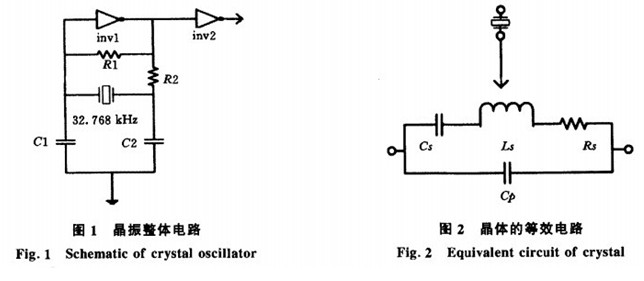 如圖1 所示是晶振的整體電路.R1為反相器invl提供偏置,使其中的MOS管工作在飽和區(qū)以獲得較大的增益;C1,C2和雜散電容一起構成晶體的電容負載, 同時它們和反相器invl一起可以等效為一負阻, 為晶體提供其振蕩所需要的能量; R2用來降低對晶體的驅(qū)動能量, 以防止晶體振壞或出現(xiàn)異常; 反相器inv2對invl的輸出波形整形并驅(qū)動負載.