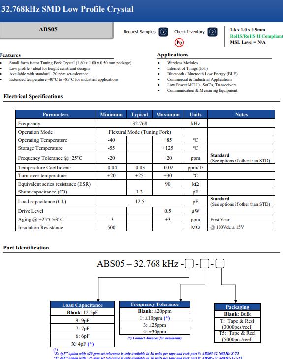 更多>>低輪廓超小型石英晶體ABS05-32.768KHZ-9-T用于藍牙低能量應(yīng)用