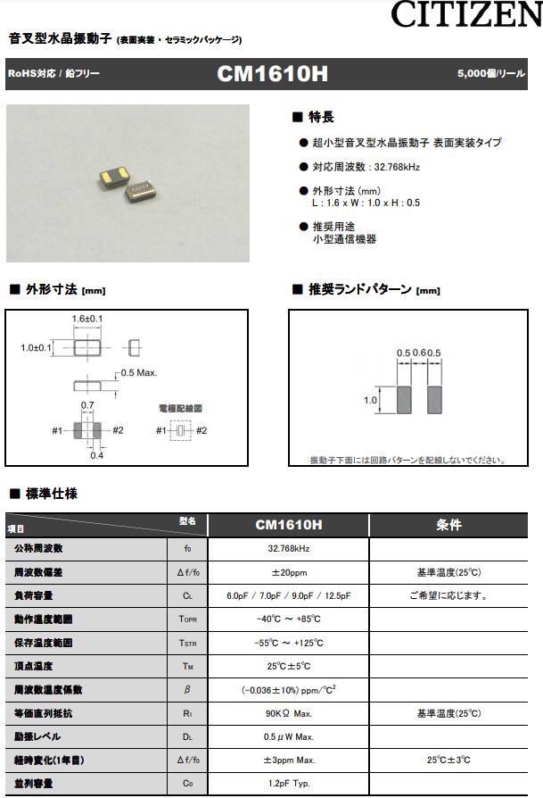 | CM1610H32768DZBT | Citizen Finedevice Co Ltd | CM1610H | kHz Crystal (Tuning Fork) | 32.768kHz |