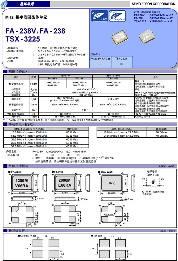 日本愛普生晶振FA-238V是一款小體積尺寸3.2x2.5mm四腳貼片晶振,無源晶振,石英晶體諧振器,FA-238V頻率范圍12.000MHz至15.9999MHz之間,可以在-40℃至+85℃(+105℃)溫度內穩定工作,該產品具有超小型,輕薄型,耐熱、耐振、耐沖擊等優良的耐環境特性,3225mm體積貼片晶振,該產品已被確定的高信賴性最適合用于汽車電子部件,在極端嚴酷的環境條件下也能發揮穩定的起振特性。滿足無鉛焊接的高溫回流溫度曲線要求,符合AEC-Q200標準。被廣泛用于移動通訊,智能手機,平板電腦,汽車電子,移動電話,無線藍牙,ISM頻段電臺廣播,MPU時鐘等.