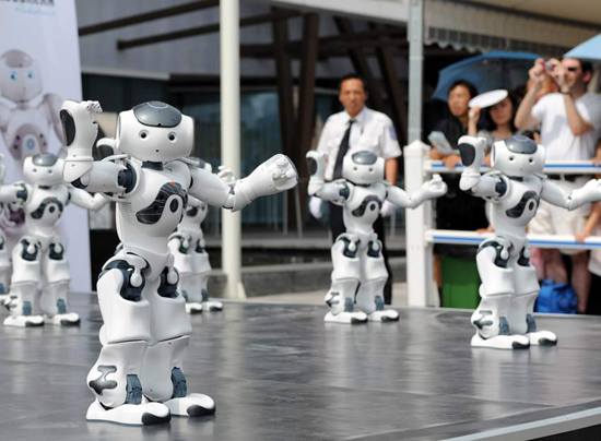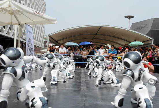 上海世博會迎來法國館國家館日活動。在法國館外,20個憨態(tài)可掬的機(jī)器人“腦”和著音樂的節(jié)拍,為觀眾帶來精彩的集體舞表演,吸引了眾多觀眾觀看。據(jù)介紹,身高58厘米的機(jī)器人“腦”,跳舞、爵士樂、足球樣樣精通,還通曉20多個國家的語言,被一些觀眾稱為“小天才”。