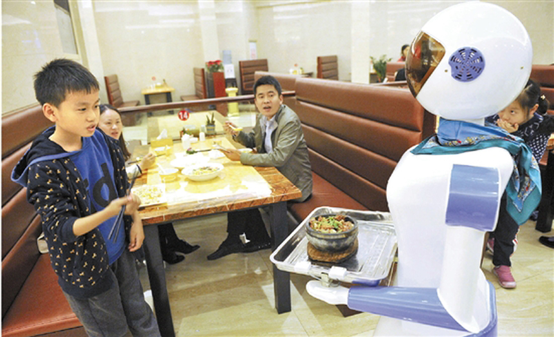 這是一家餐廳剛剛開業(yè),里面有5個機(jī)器人:兩個送餐,并且能報出各種菜名,三個小機(jī)器人在門口跳舞助興。機(jī)器人送餐、跳舞助興,這些以往只能在科幻電影中看到的場面,在寧波慈溪的一家餐廳成為現(xiàn)實。據(jù)老板利用機(jī)器人送餐,相比雇人,光兩個送菜機(jī)器人一年能省20多萬元。