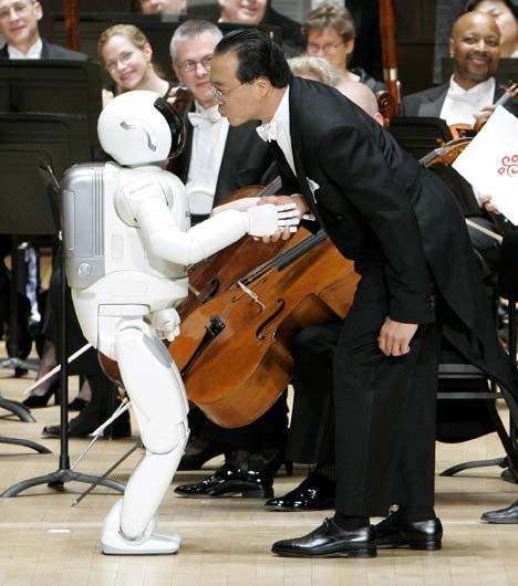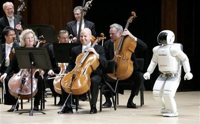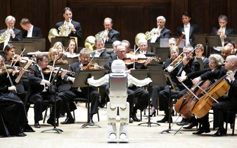 機(jī)器人現(xiàn)場指揮交響樂 點頭鞠躬無所不能,在一片暗淡光線的籠罩下,坐無缺席的音樂大廳逐漸安靜下來,指揮家像模像樣地走了出來,站在觀眾面前的是一個全身閃著亮光的白顏色機(jī)器人,高4英尺三英寸。這個非同尋常的機(jī)器人名為ASIMO,它于本周二晚接受了一次嚴(yán)峻挑戰(zhàn):現(xiàn)場指揮底特律交響樂團(tuán),樂團(tuán)演奏的是百老匯音樂劇《夢幻騎士》中的精彩曲目《不可能的夢想》。ASIMO以小孩子的口吻對觀眾說:“大家好”,隨后向樂隊擺手,示意演出開始。