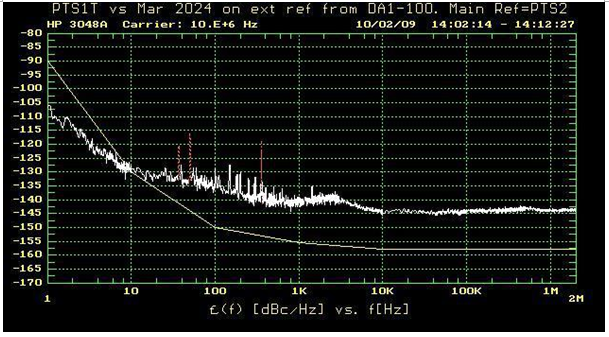 馬可尼2024現(xiàn)在設(shè)置為使用外部基準(zhǔn)電壓源.另一個(gè)CFS10B-03用作外部基準(zhǔn)電壓源. 相位噪聲的測量方法與以前完全相同.